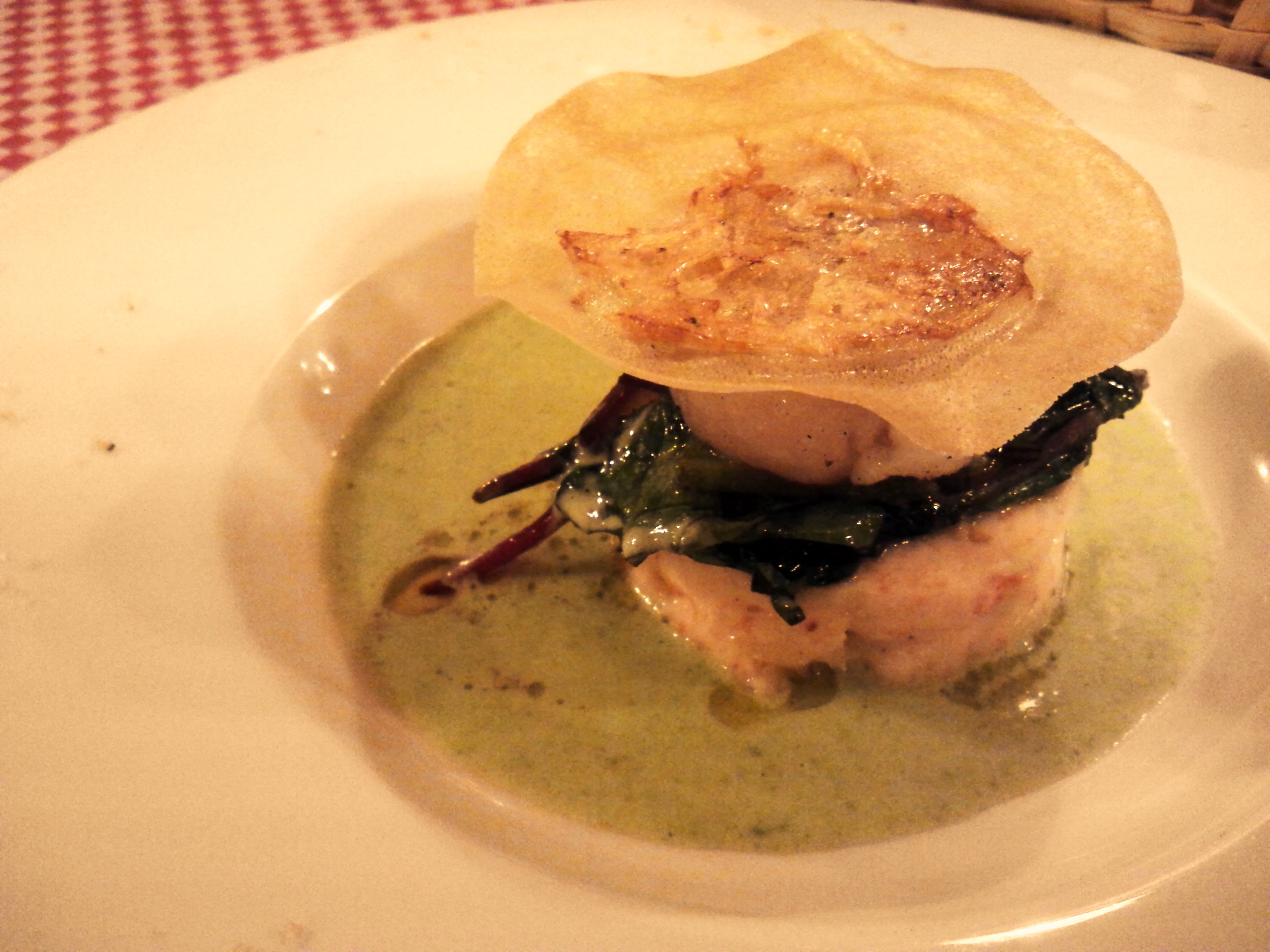 ホタテのグリルとエビのムース、ほうれん草のソース仕立て。